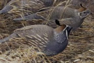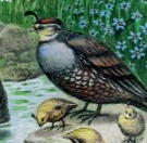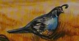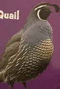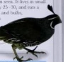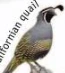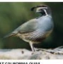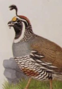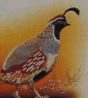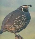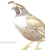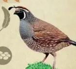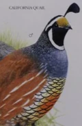 The California quail, also known as the California valley quail or valley quail, is a small ground-dwelling bird in the New World quail family. These birds have a curving crest or plume, made of six feathers, that droops forward: black in males and brown in females; the flanks are brown with white streaks.