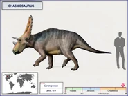 Chasmosaurus is a genus of ceratopsid dinosaur that lived during the Upper Cretaceous Period in North America. Its name means "opening lizard", referring to the large openings in its frill. With a length of 4.3–4.8 metres and a weight of 1.5–2 tons, Chasmosaurus was a medium ceratopsian of average size.