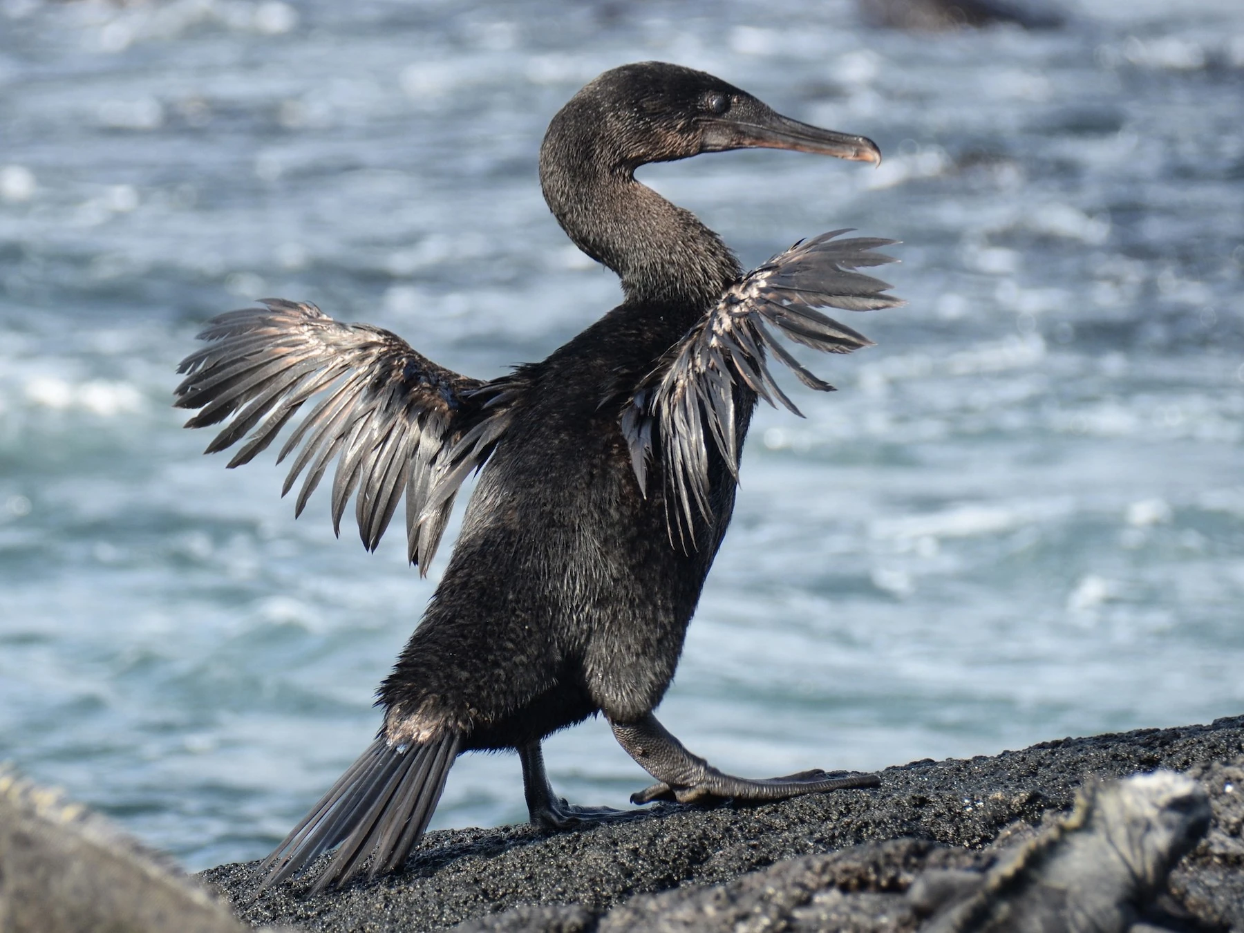 The flightless cormorant, also known as the Galapagos cormorant, is a cormorant endemic to the Galapagos Islands, and an example of the highly unusual fauna there. It is unique in that it is the only known cormorant that has lost the ability to fly. It’s also the largest species of Cormorant in the world.